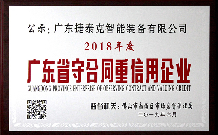 近年來,廣東91成人版智能裝備有限公司堅持以誠信建設為基礎,全麵打(dǎ)造誠信文化,在經營管理(lǐ)中,重視企業信譽,恪守誠信經營,嚴格合同(tóng)管(guǎn)理,狠抓經營和(hé)管理工作,主動履行企業社會責任,廣受社會各界好評!